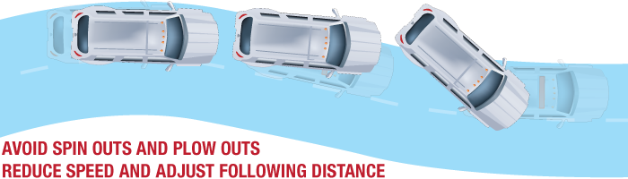 Spin outs and plow outs most often occur when you are taking turns too sharply and quickly; and when you make sudden maneuvers on slippery roads. You should always be sure to take turns slowly and carefully – which may require you to reduce your speed – and adjust your following distance on slippery roads so that you can brake or steer to safety sooner when needed.